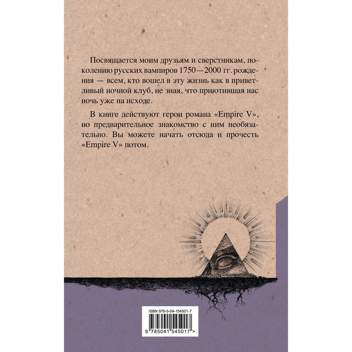 Посвящается моим друзьям и сверстникам, поколению русских вампиров 1750-2000 гг. рождения - всем, кто вошел в эту жизнь как в приветливый ночной клуб, не зная, что приютившая нас ночь уже на исходе.В книге действуют герои романа «Empire V», но предварительное знакомство с ним необязательно. Вы можете начать отсюда и прочесть «Empire V» потом.