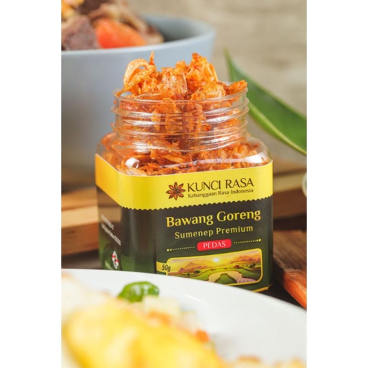 Bawang goreng Kunci Rasa terbuat dari bawang merah asli 100% sumenep yang super premium dan kualitasnya terjaga karena diolah sesuai standar halal dan BPOM. Cocok untuk teman makan apapun dan dimanapun karena kemasannya yang praktis bisa dibawa kemana aja. Pake nasi hangat juga udah mantep banget!