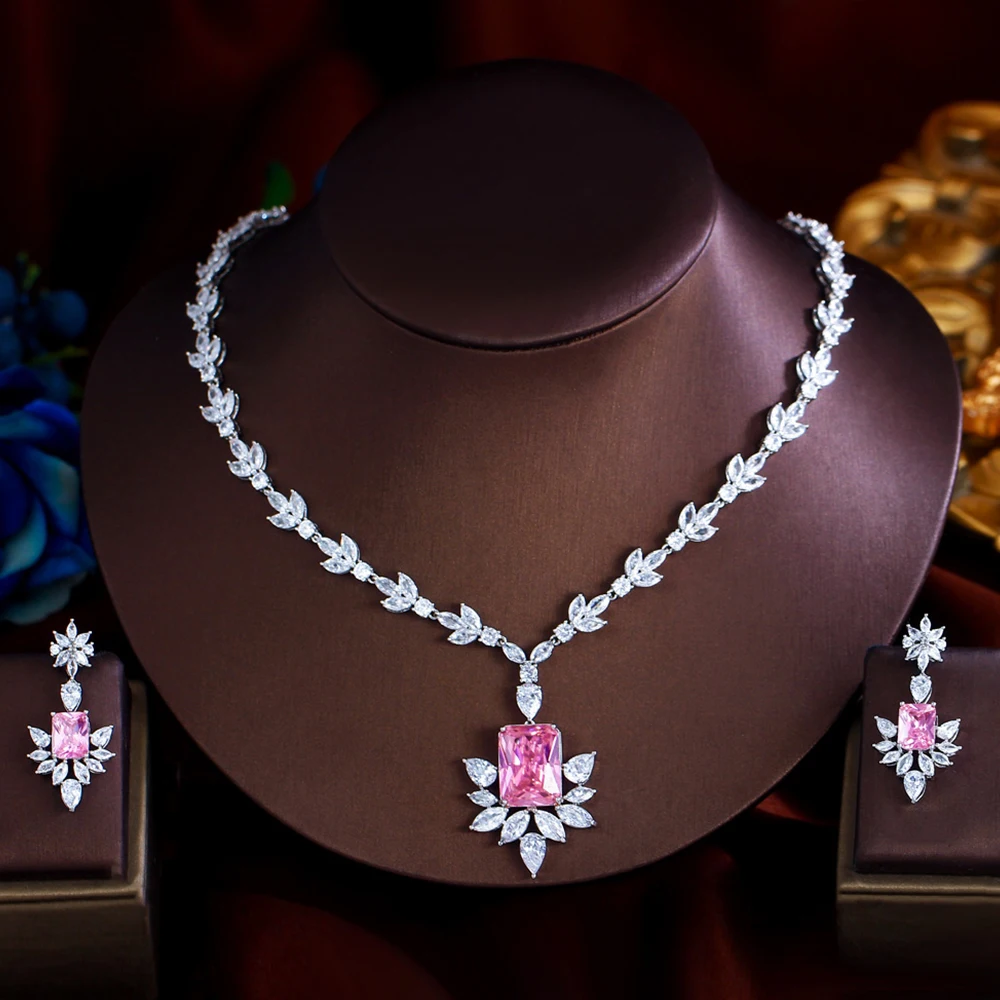 BeaQueen Роскошный Геометрический Розовый Белый CZ Кристалл Кулон Ожерелье Серьги Набор для Женщин Свадьба Помолвка Ювелирные Изделия Подарки JS216