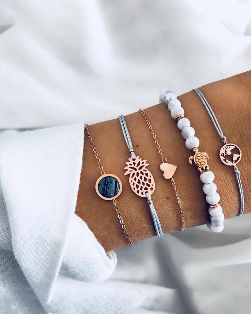 Beaded Animal Heart Pineapple Pattern 5PCS Layered Bracelet, Gold