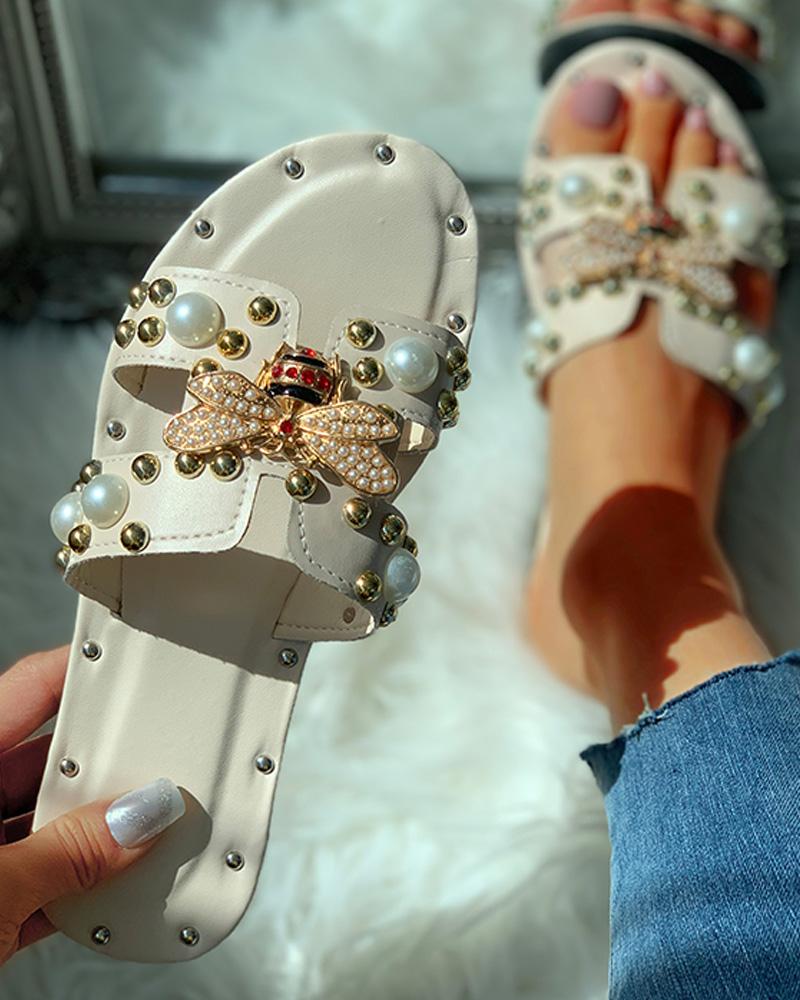 Beaded Bee Pattern Open Toe Slippers, Beige