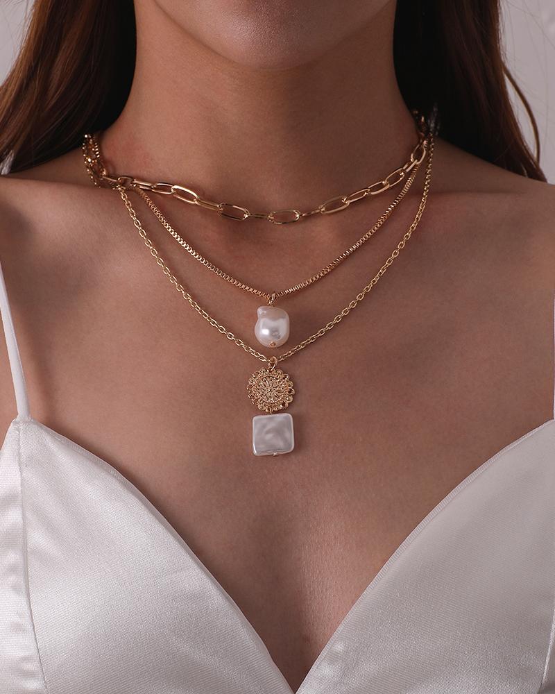 Beaded Chain Floral Pattern Layered Pendant Necklace, Gold