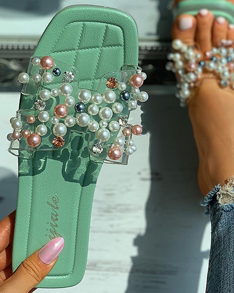Beaded Clear Perspex Square Toe Slide Sandals, Green