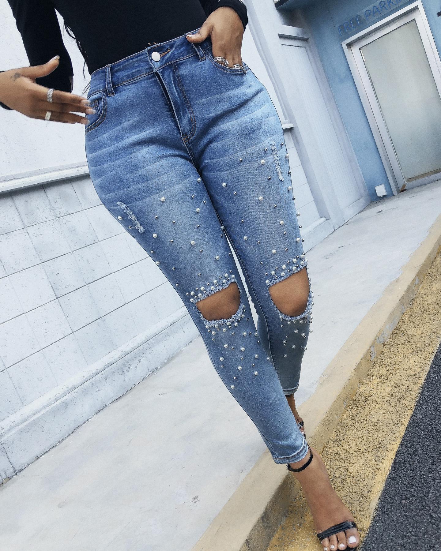 Beaded Pocket Design Cutout Ripped Jeans, Blue