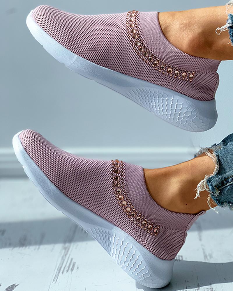 Beaded Rhinestone Breathable Knit Slip On Sneaker, Pink