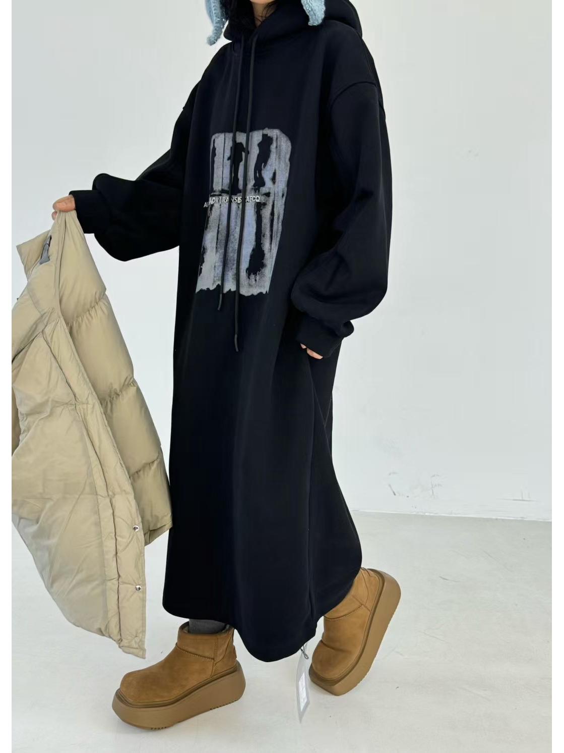 Becabeau Зимнее платье-толстовка с капюшоном большого размера в корейском стиле на флисовой подкладке (961399) One Size чёрный