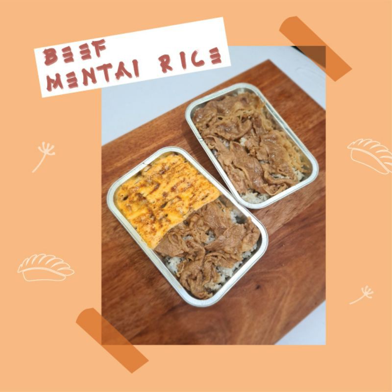 nasi gurih yang dilapisi dengan daging sapi premium yang dimasak dengan bumbu homemade dans saos mentai diatasnya.