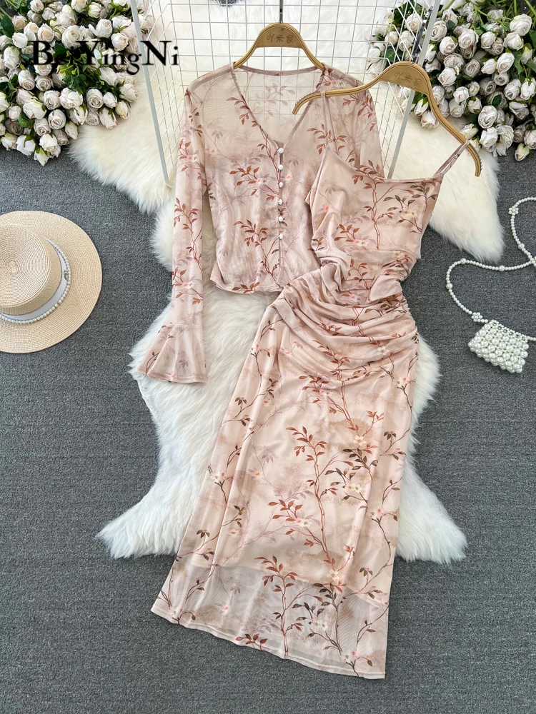 Beiyingni весенне-летнее корейское платье с V-образным вырезом, женские топы с длинным рукавом, элегантные роскошные приталенные платья, женские повседневные футболки с принтом