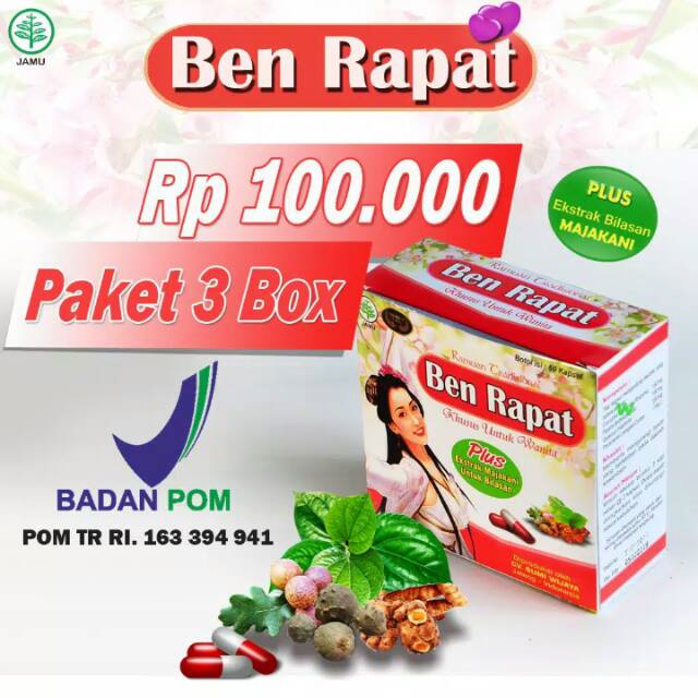 Formulasi 2 in 1 ekstrak kapsul dari dalam dan bilasan dari luar, Ben Rapat efektif mengatasi masalah kewanitaan. Dan menjadi herbal pertama yang memiliki fungsi terapi ganda (dari dalam dan dari luar)
