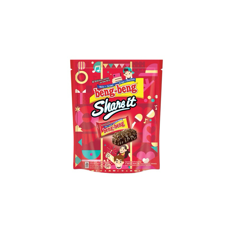 Nikmati paduan cokelat, wafer, karamel, dan rice crispy dalam satu gigitan beng-beng Share It. Menikmati legitnya beng-beng Cokelat ketika digigit membuat saat santai Anda dan keluarga menjadi momen yang mengasikkan. Tersedia dalam kemasan isi 25 pcs yang cocok dinikmati bersama di suasana berkumpul bersama.