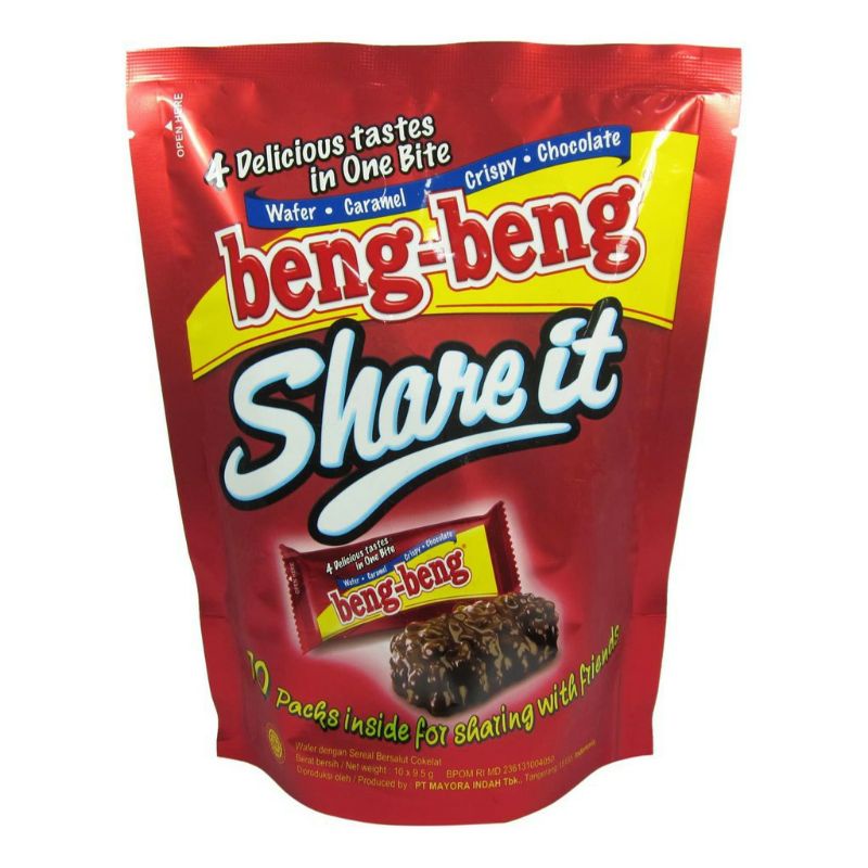 Beng beng share it merupakan wafer cokelat dengan rice crispy yang berbalut cokelat susu yang nikmat dan lapisan cream yang lezat dan lembut.