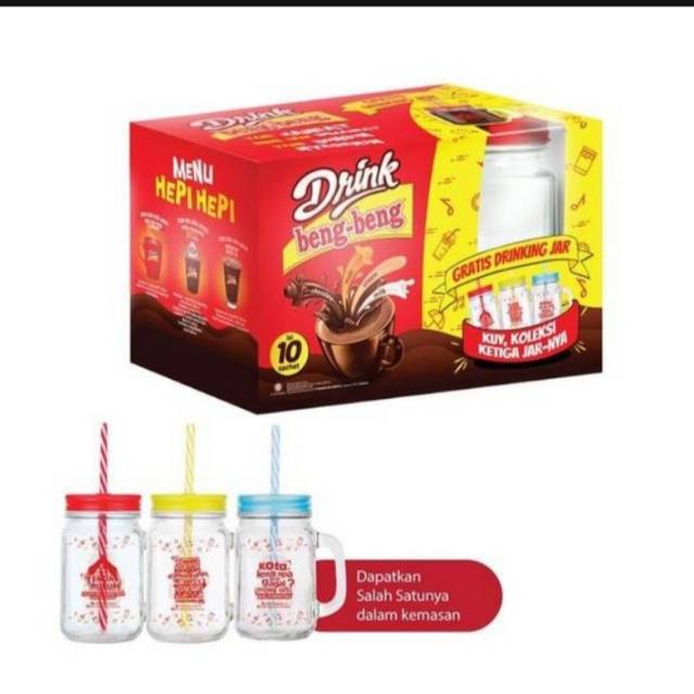 Drink Beng-Beng Free Drinking Jar, adalah Minuman Cokelat [Kemasan Pouch] merupakan minuman cokelat yang terbuat dari coklat, malt, cream, dan milk, dapat disajikan panas maupun dingin sehingga cocok dinikmati bersama keluarga maupun kerabat terdekat Anda.berhadiah langsung Drinking Jar unik dalam kemasan #bejgbeng