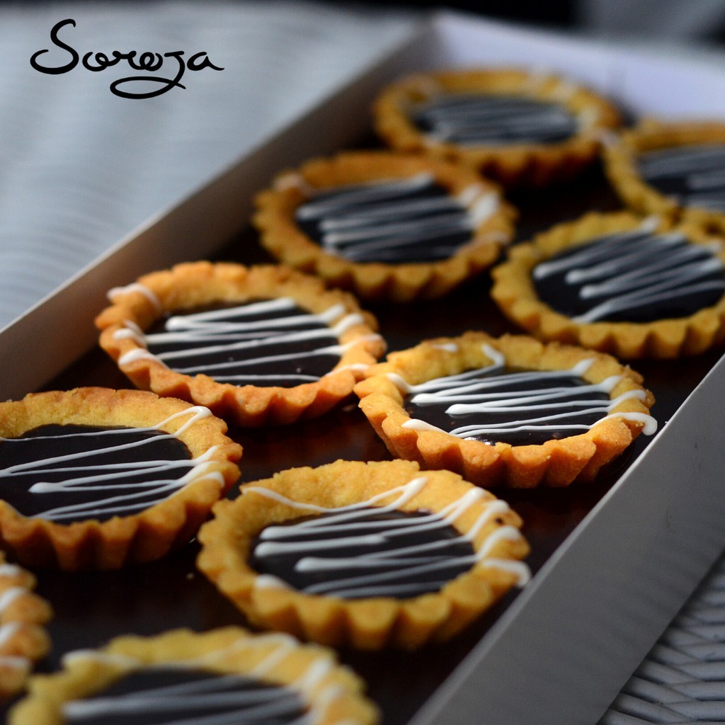 Pie kering dengan isian cokelat hitam yang ditambah potongan buah asli stroberi khas Ciwidey.