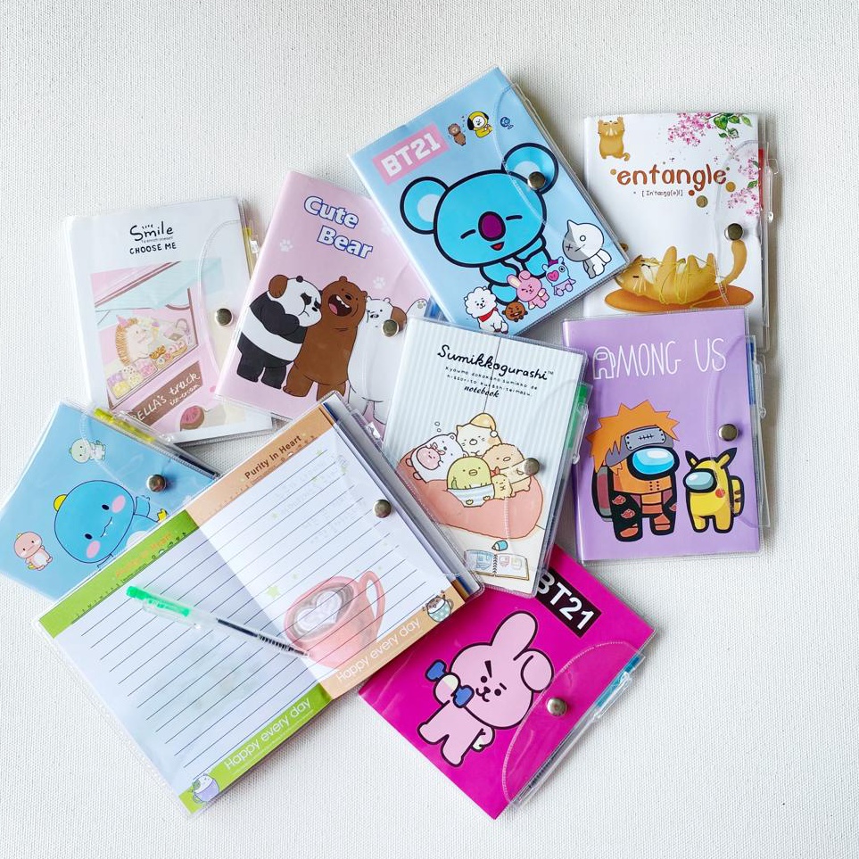 Notebook ukuran A6 dengan cover plastik slip kertas. Isi kertas sebanyak 60 lembar, kertas bermotif atau bergambar. Tepat 13 baris dalam 1 lembar dengan ketebalan garis 0.85cm