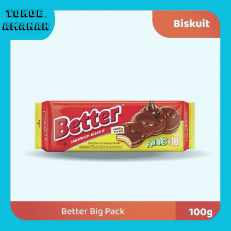 Better big pack 100 gram merupakan biskuit dengan vanilla krim. sandwich biskuit dengan vanilla lembut yang dilapisi dengan cokelat tebal yang lezat.