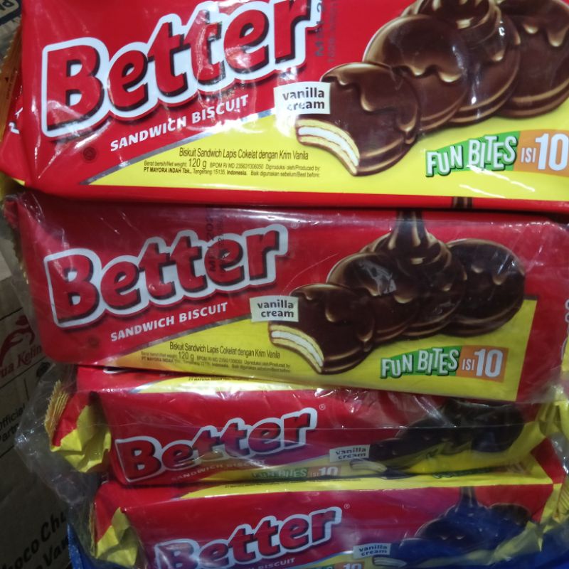 biskuit better dengan balutan coklat diluar dan cream di dalam. isi 10 pcs per pack dengan berat bersih 120 gr.
