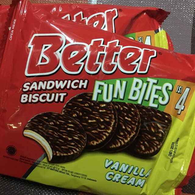 Nikmati lezatnya biskuit sandwich renyah BETTER dengan balutan cokelat tebal serta sensasi krim vanila yang lembut, hmm..