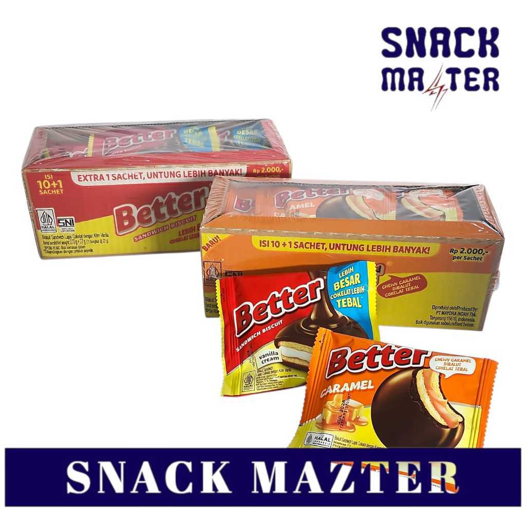 Better adalah biskuit sandwich berlapis coklat dgn isian krim produksi PT. Mayora Indah Tbk - Tangerang. Berupa sandwich biskuit renyah berlapis coklat yg enak khas Mayora, dgn isi krim vanila yg lembut dan wangi. Bagaikan membuat hati kita menjadi lebih better saat menikmati kelezatannya. Semua menyukainya :). Ber BPOM, Halal MUI dan jaminan mutu dari Mayora, cemilan biskuit sandwich ini sangat cocok buat bekal anda kemanapun atau stok di laci, lemari makan, tas anda. Dijual dgn kemasan renceng per 10 bks individual dgn netto @22gr. Monggo di order :)