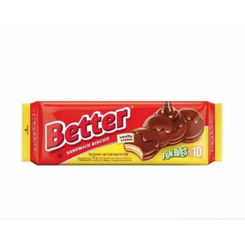 Better Fun Bites Big Pack 100gr merupakan biskuit dengan vanila krim. Sandwich biskuit dengan krim vanilla lembut yang dilapisi dengan cokelat tebal yang lezat. Memberi Anda rasa yang sempurna untuk setiap momen.