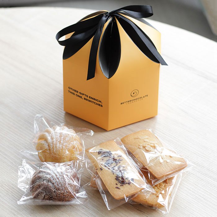 2 Madeleines ( 1 Mocha, 1 Lemon Vanilla), 4 Financiers ( 1 Plain, 1 Choco, 1 Cheese, 1 Apple Cheese), and Flower Box