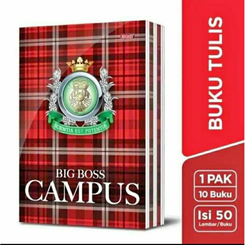 Buku tulis campus merek Big BOSS ukuran Boxy. Isi 50 lembar/buku, 10 buku/pack. Harga tertera merupakan harga per pack isi 10 buku.