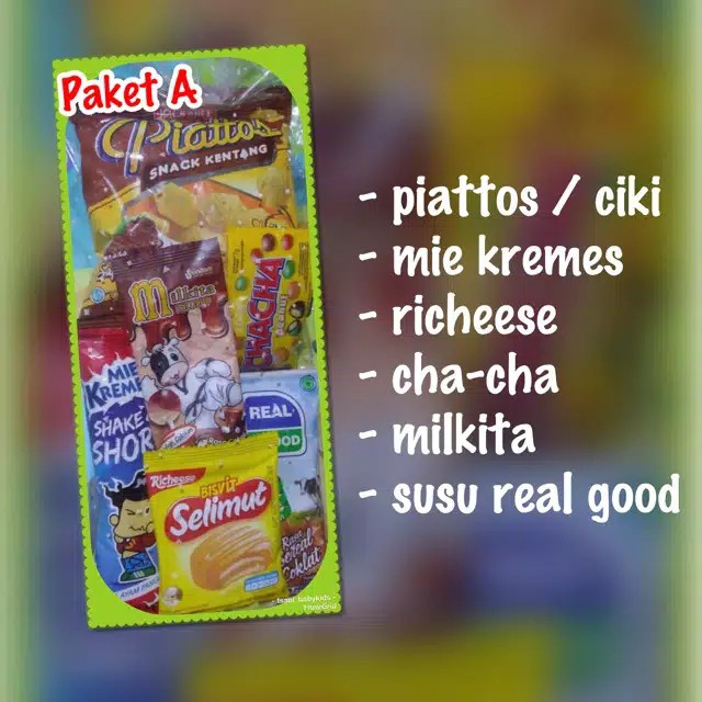 Isi bingkisan Piattos, mie kremes, richeese, cha-cha, milkita, susu real good