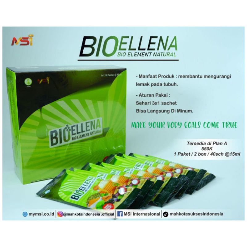 bioellena adalah minuman herbal untuk membantu menjaga kesehatan tubuh. mengontrol/ menghilangkan lemak yg berlebihan. isi persachet 15ml. dapatkan promo paket diet murah. beli 10sachet. lebih hemat.