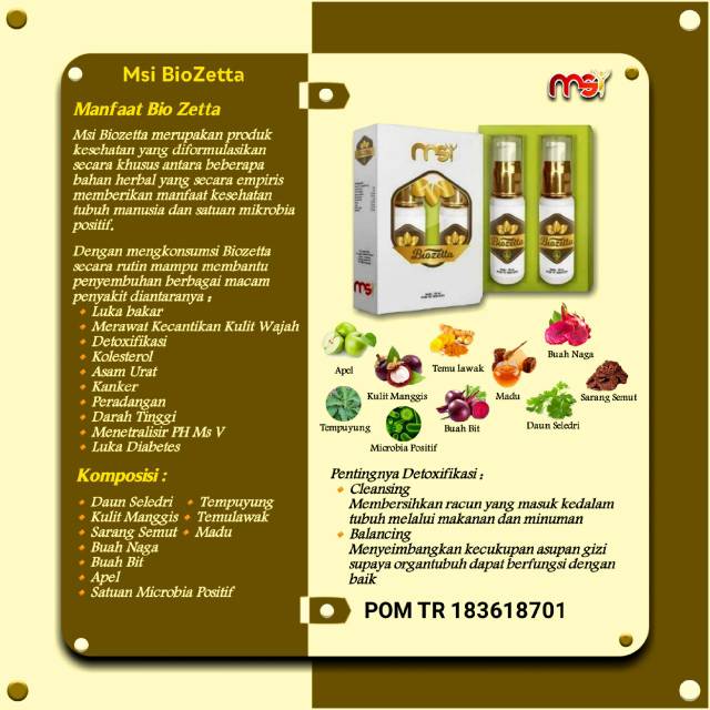 MSI BIOZETTA merupakan produk kesehatan yang diformulasikan secara khusus antara beberapa bahan herbal yang secara empiris memberikan manfaat kesehatan tubuh manusia dan satuan mikrobia positif.