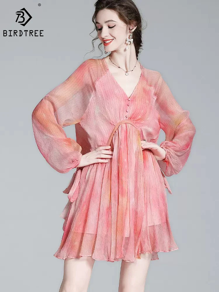 Birdtree/100% шелк тутового шелкопряда, 6А, платье Французский темперамент, возраст-уменьшение, v-образный вырез, пышные рукава, элегантная розовая юбка средней длины для женщин, D39846QD