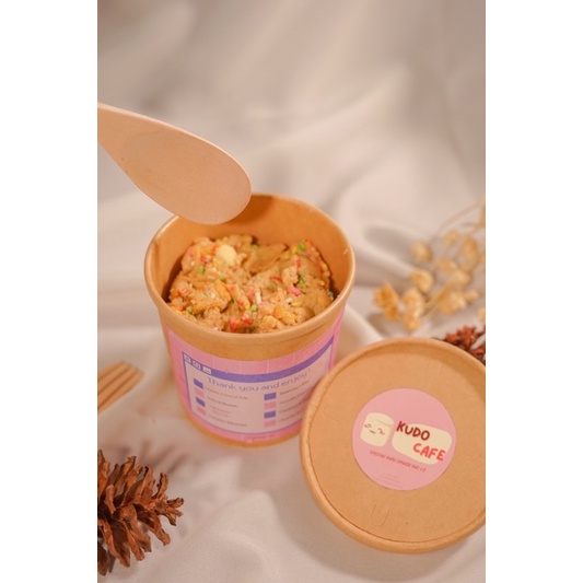 edible cookie dough dengan topping rainbow sprinkle, marshmallow, white chocochip, dan cornflakes, bisa tahan dalam freezer selama 2 minggu