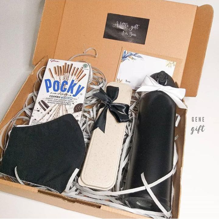 Gift Box yang bertema monochrome ini cocok banget loh buat orang yang kamu sayang agar dia bisa lebih menjaga kesehatan dengan selalu menggunakan masker saat bepergian, banyak minum air putih mengggunakan Tumbler yang sporty banget, dan lebih higienis menggunakan set alat makan sendiri.