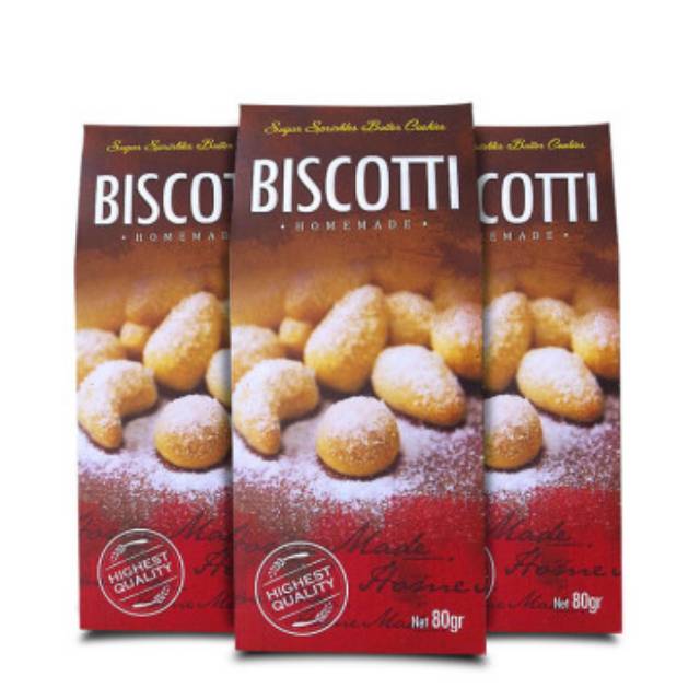Biscotti sugar sprinkle premium butter cookies , merupakan cookies yg diadaptasi dari italy yg berisikan adonan butter dengan crunchy cashews yg diselimuti dengan springkle sugar atau biasa disebut gula halus.