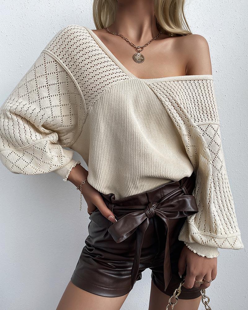 Bishop Sleeve V-Neck Open Knit Sweater, Khaki