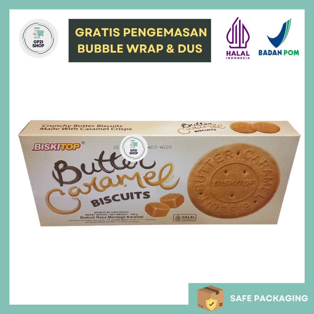 Biskuit rasa mentega karamel. Biskuit yang cocok untuk cemilan dan snack, maupun keperluan acara/hampers/parcel dengan harga murah dan enak.