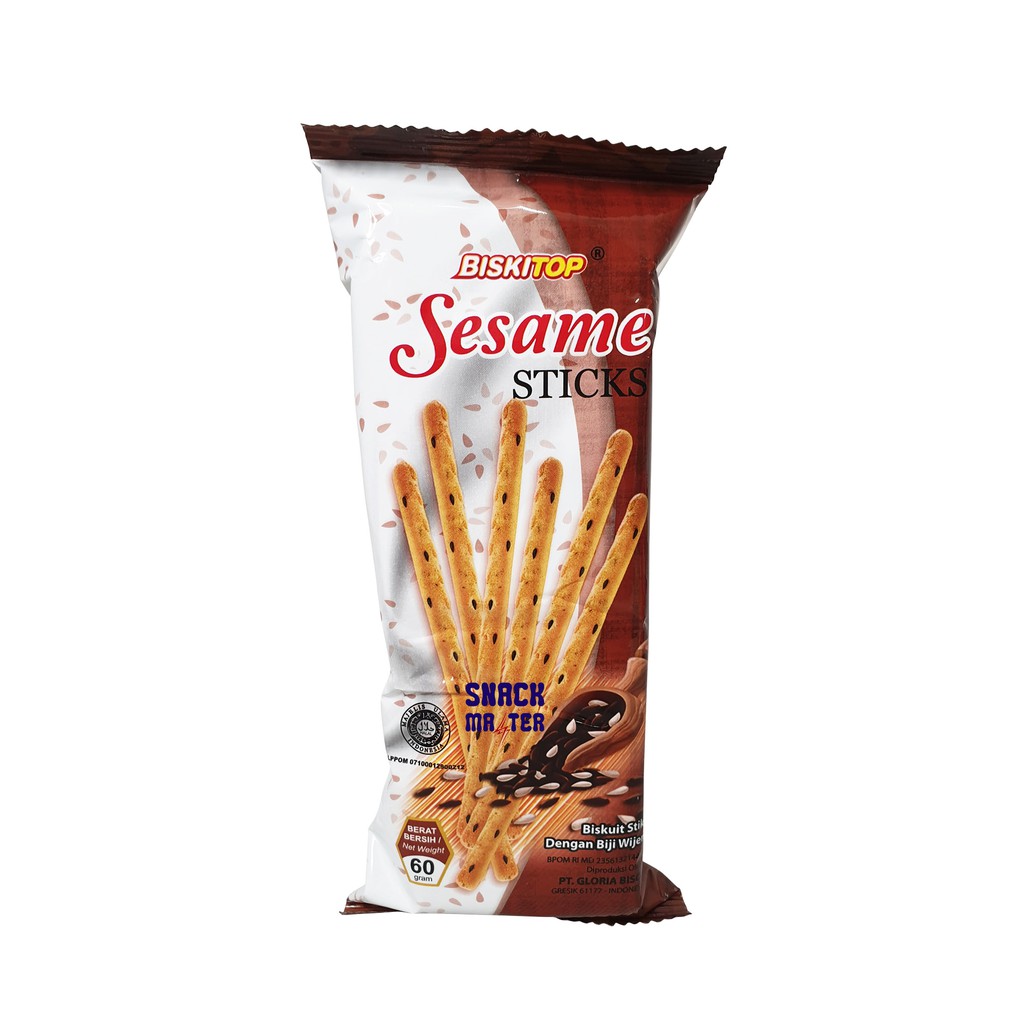 Biskitop Sesame Stik merupakan biskuit stik yg renyah dgn rasa biji wijen yg gurih. Bernetto 60 gram. Ber BPOM dan Halal MUI.