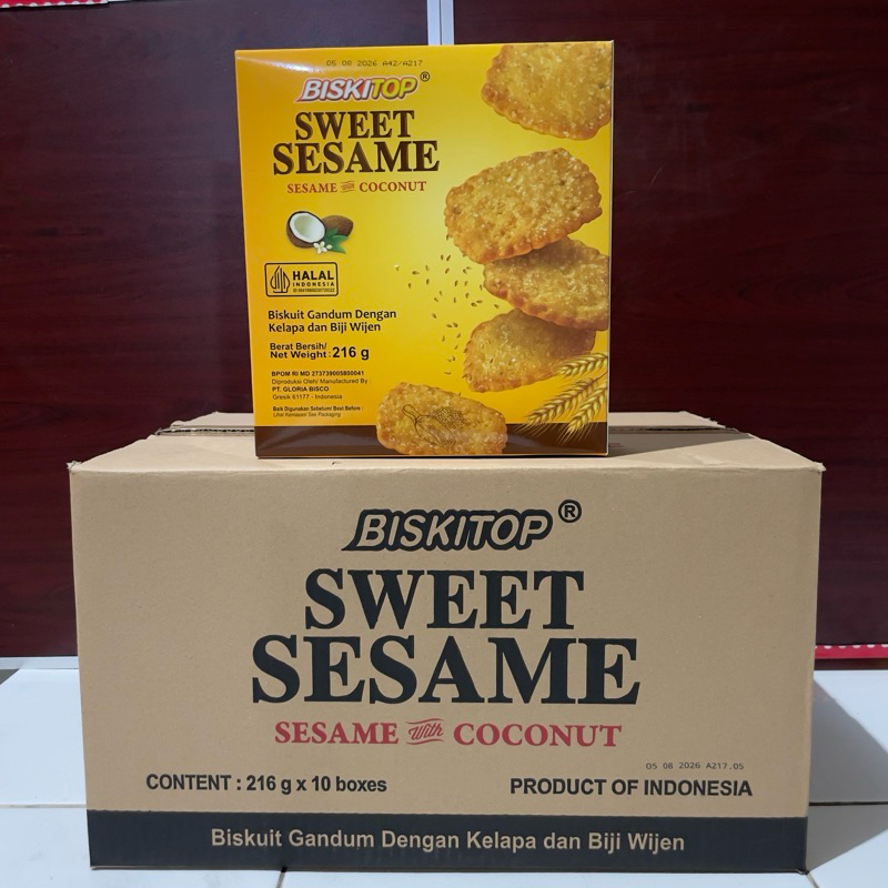 Satu karton Biskitop Sweet Sesame berisikan 10 box