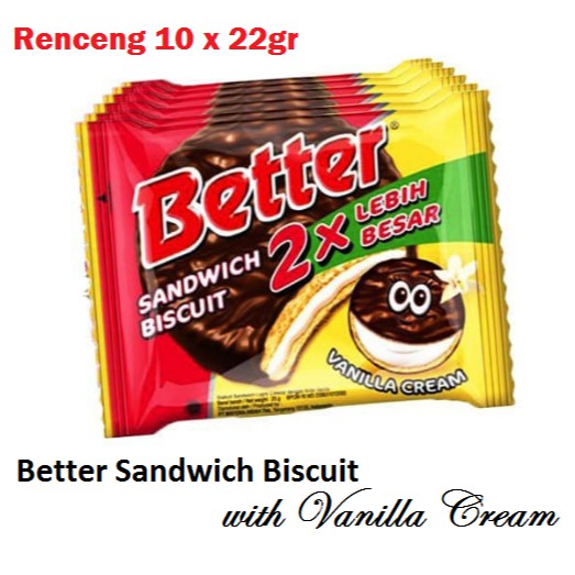 Better adalah biskuit sandwich berlapis coklat dgn isian krim produksi PT. Mayora Indah Tbk - Tangerang. Berupa sandwich biskuit renyah berlapis coklat yg enak khas Mayora, dgn isi krim vanila yg lembut dan wangi. Bagaikan membuat hati kita menjadi lebih better saat menikmati kelezatannya. Semua menyukainya dan jaminan mutu dari Mayora, cemilan biskuit sandwich ini sangat cocok buat bekal anda kemanapun atau stok di laci, lemari makan, tas anda.