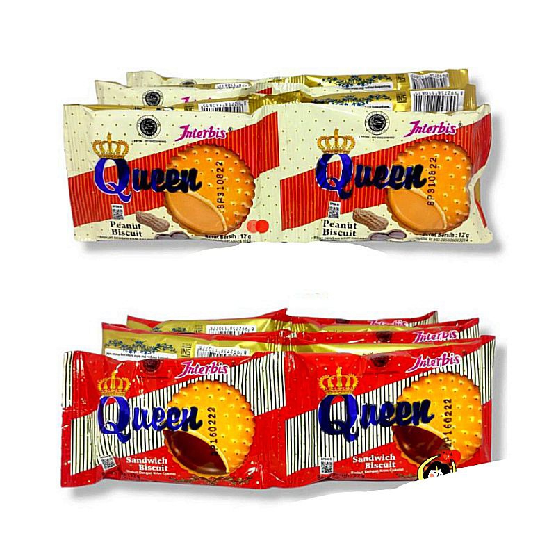 Biskuit interbis queen adalah biskuit marie yang dilapisi cokelat, terbuat dari bahan bahan berkualitas tinggi.Rasanya wangi cokelat & renyah biskuit.