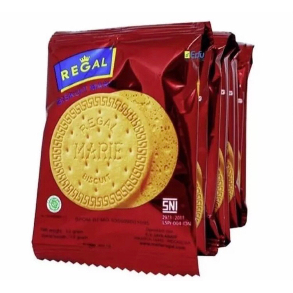 Regal marie di olah dengan tepung terigu protein tinggi mentega yang di impor dari Australia dan susu untuk meningkatkan tekstur dan rasa dengan 2 keping biskuit di setiap kemasannya ideal di jadikan cemilan saat Santai bersama teman atau keluarga