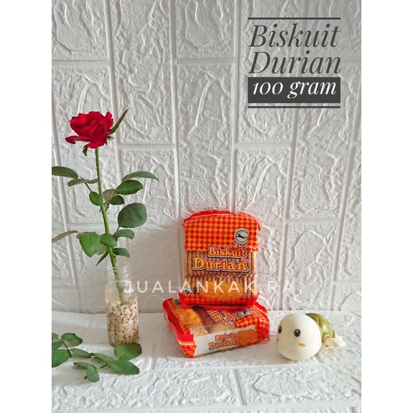 Biskuit rasa durian berbentuk bulat, bertabur gula, cocok untuk camilan di segala situasi. Bisa di bawa kemana-mana karena kemasannya 110gram