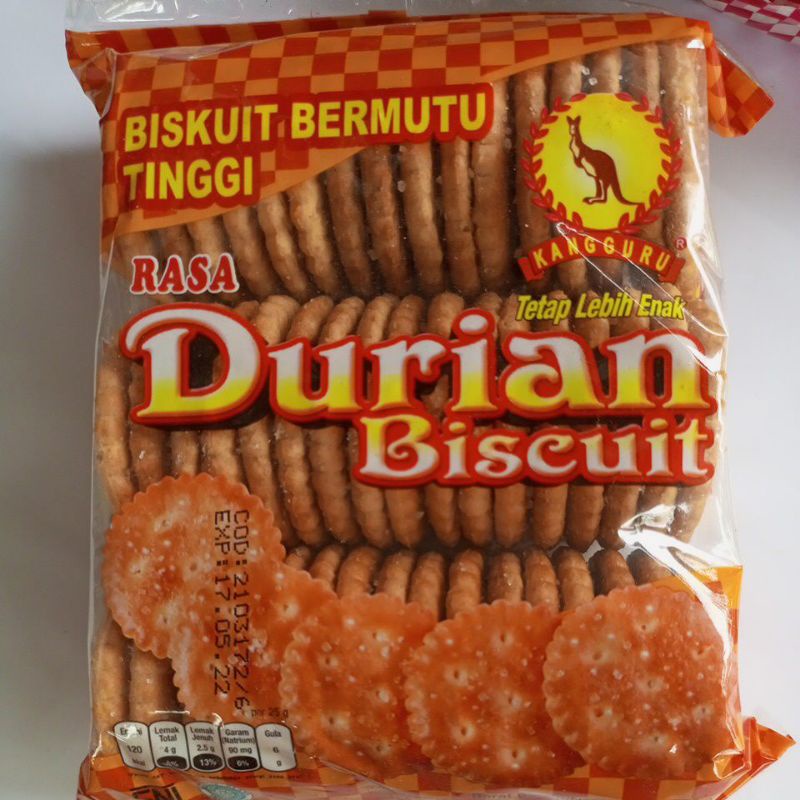 Biskuit berlapis gula rasa durian,cocok untuk teman minum teh/kopi.Berat 120grm