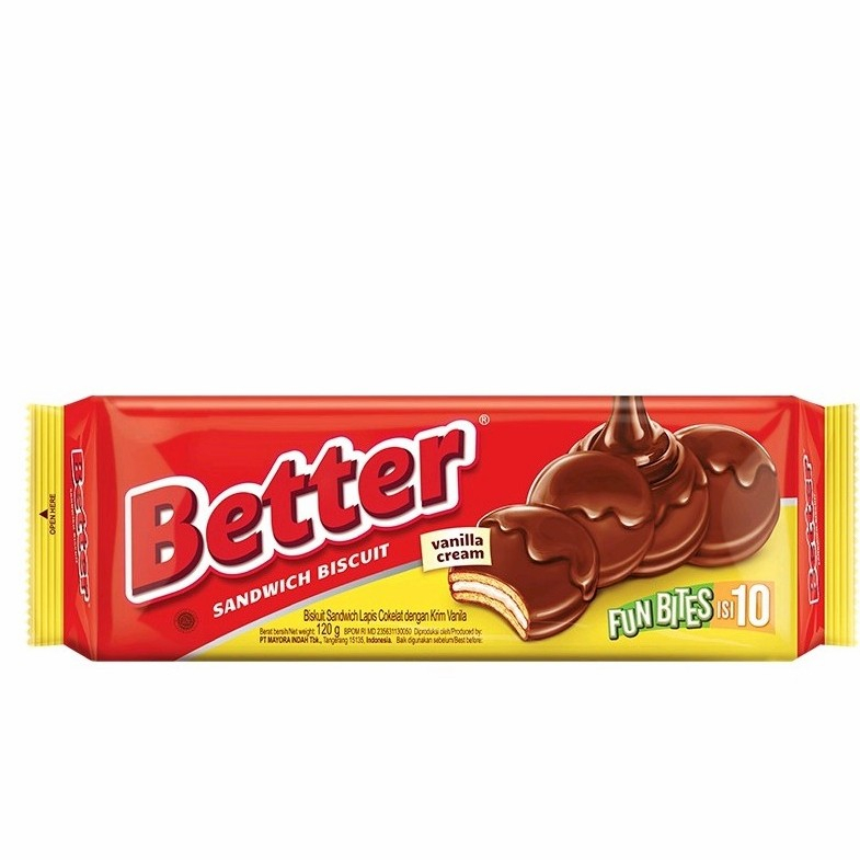 BETTER Vanilla merupakan sandwich biskuit dengan krim vanila lembut berlapis cokelat yang hadir dengan rasa lezat dan nikmat. Sandwich biskuit ini juga dibuat dari coklat dan biskuit pilihan yang diproses secara modern dan higienis. Sandwich biskuit ini dapat disantap secara langsung dan dinikmati saat santai bersama keluarga.