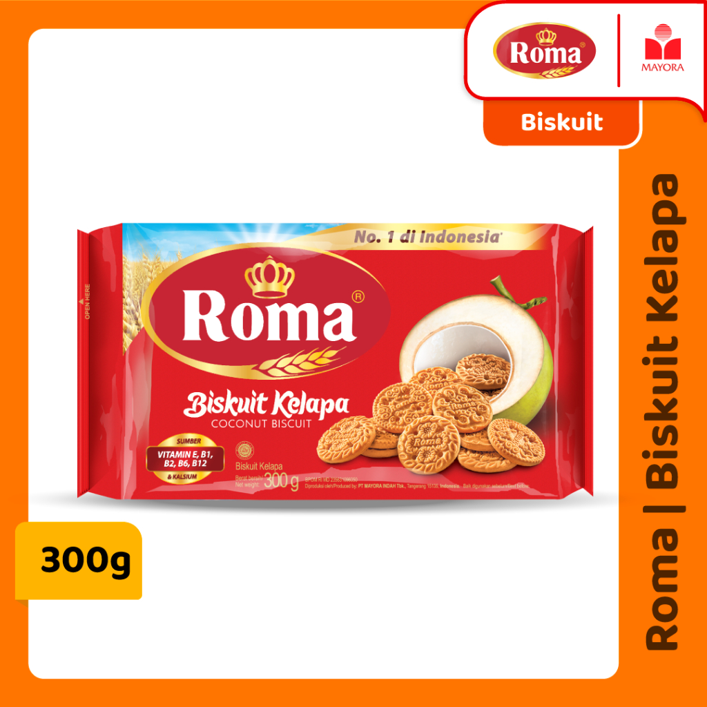 Roma Biskuit Kelapa adalah biskuit kelapa dengan rasa renyah dan gurih yang dihasilkan dari kelapa pilihan. Rasa kelapa asli dari Roma biskuit ini telah menjadi kesukaan banyak orang, baik di Indonesia atau pun di berbagai negara lain. Diperkaya dengan vitamin B1, B2, B6, B12, dan E, serta kalsium, biskuit Roma Kelapa ini akan menjadi teman biskuit kelapa yang sehat untuk Anda. Jalani hari-hari bersama kerenyahan biskuit Roma Kelapa, teman yang baik untuk Anda.