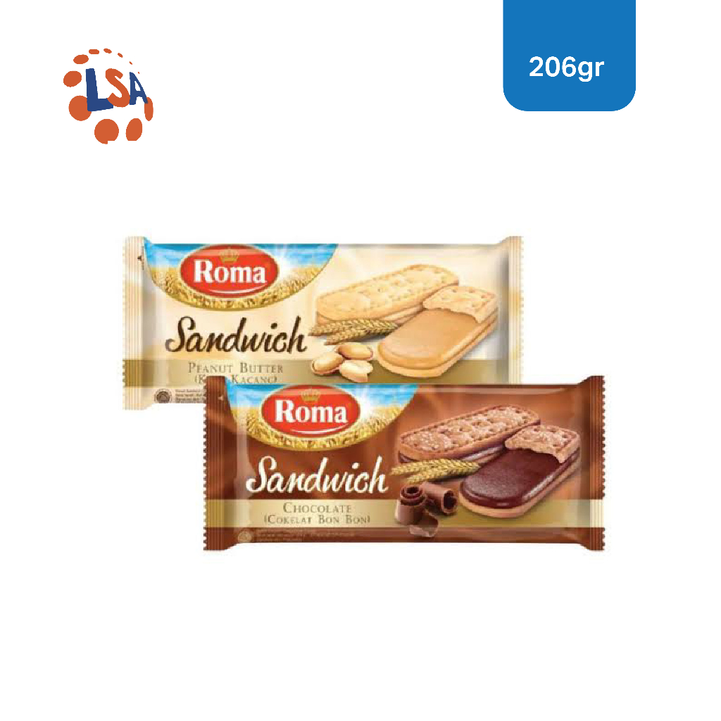 Roma Sandwich biskuit yang terdiri dari dua lapisan biskuit yang tipis dan ringan, dengan lapisan isi kacang dan coklat yang lezat di antaranya. Isi kacang ini memberikan sentuhan kaya rasa dengan aroma kacang yang khas kombinasi kacang yang gurih dengan tekstur biskuit yang renyah menciptakan pengalaman makan sandwich yang memuaskan.