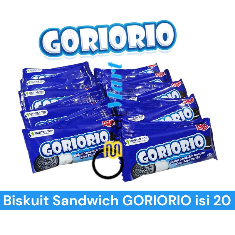 Goriorio Renceng isi 20 merupakan biskuit sandwich krim dengan rasa vanila. Cemilan ini cocok buat bekal sekolah anak, buat bingkisan ulang tahun atau buat ngumpul santai bersama teman atau keluarga.