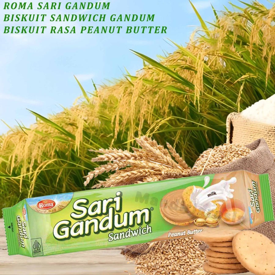 Roma Sari Gandum Sandwich Biskuit Peanut Butter yang gurih dan lezat, sehingga cocok untuk dijadikan biskuit andalan di sela-sela aktifitas yang padat. Ditambah lagi dengan adanya berbagai varian ukuran kemasan yang dimilikinya, membuat Roma Sari Gandum praktis dibawa kemana saja dan dimana saja. Jadi tunggu apalagi? selalu sediakan Roma Sari Gandum Sandwich Biskuit sekarang juga ya.Kelezatan Roma Sari Gandum memang selalu menjadi pilihan untuk menemani waktu mengemil Anda. Pasalnya, biskuit Roma Sari Gandum terbuat dari tepung gandum yang dapat membuat kenyang lebih lama. Belum lagi, terbuat dari gandum yang utuh dan susu rendah lemak menjadikan Roma Sari Gandum kaya akan serat sehingga baik untuk kesehatan pencernaan Anda. Bahkan, Roma Sari Gandum juga kaya akan manfaat karena mengandung vitamin premix seperti B1, B2, B6 dan B12.