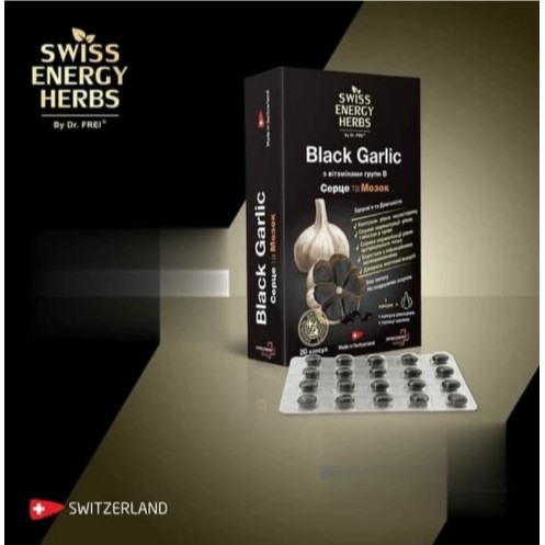 Swiss Energy Black Garlic adalah ekstrak bawang hitam yg dibuat dari bawang putih Argentina yg difermentasi secara alami di Jepang dan kemudian di proses estraksi di Swiss, Merupakan ekstrak bawang hitam pertama didunia dari Swiss dgn Vitamin B, Tidak menimbulkan bau dan iritasi lambung. kapsul lunak Swiss Energy Black Garlic dibuat dari ekstrak 1 bonggol bawang hitam, mudah dikonsumsi karena ukurannya yang kecil, minum 2 kapsul sehari akan memberi efek yang sangat luar biasa.