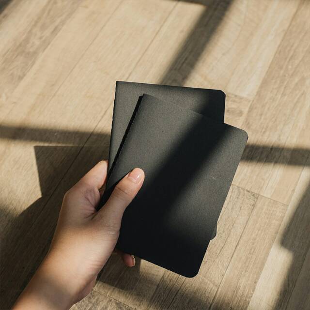 Black Paper Plain Notebook tersedia dalam 3 ukuran: B5 (paling besar), A5 (sedang), dan A6 (pocket notes) (paling kecil).