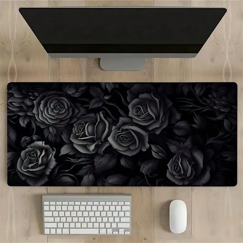 Black Rose Flower Mouse Pad Design Large Desk Mat Non-Slip Rubber Base Stitched Edges Keyboard Pad Work Game Office Accessories