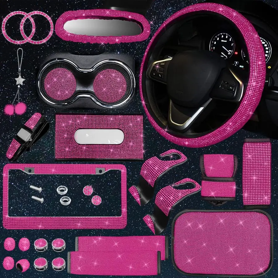 Bling Car Car Accessories Set,15 Inch Steering Wheel Cover,Shiny License Plate Frame,Center Console Cover and Rearview Mirror Se